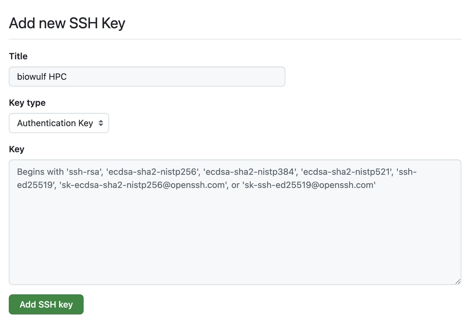 Run the following command to add the key, replacing the title with a brief description of the key. For example, I use “NCI macOS laptop” for the key I use on my GFE laptop and “biowulf” for the biowulf HPC.