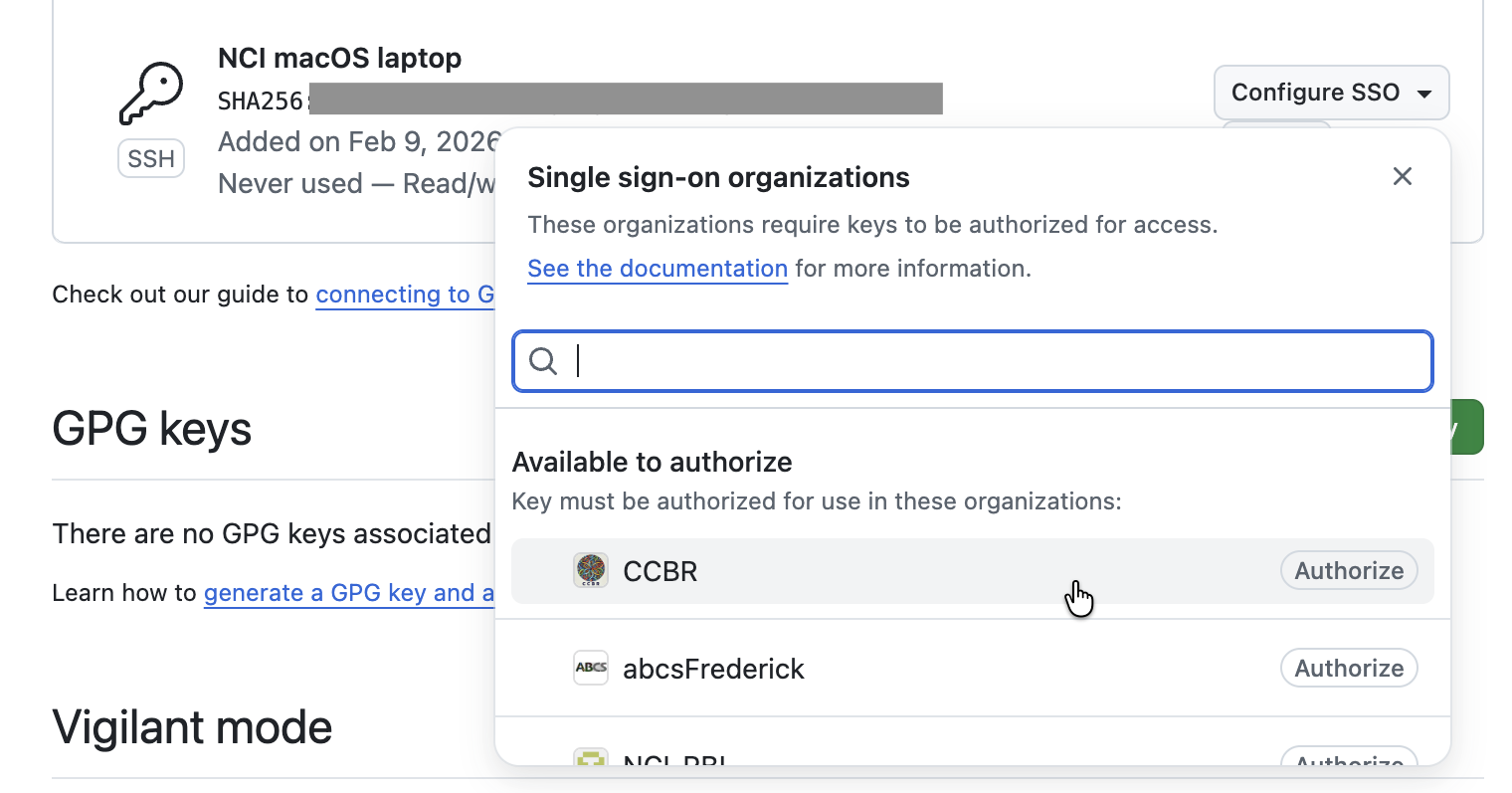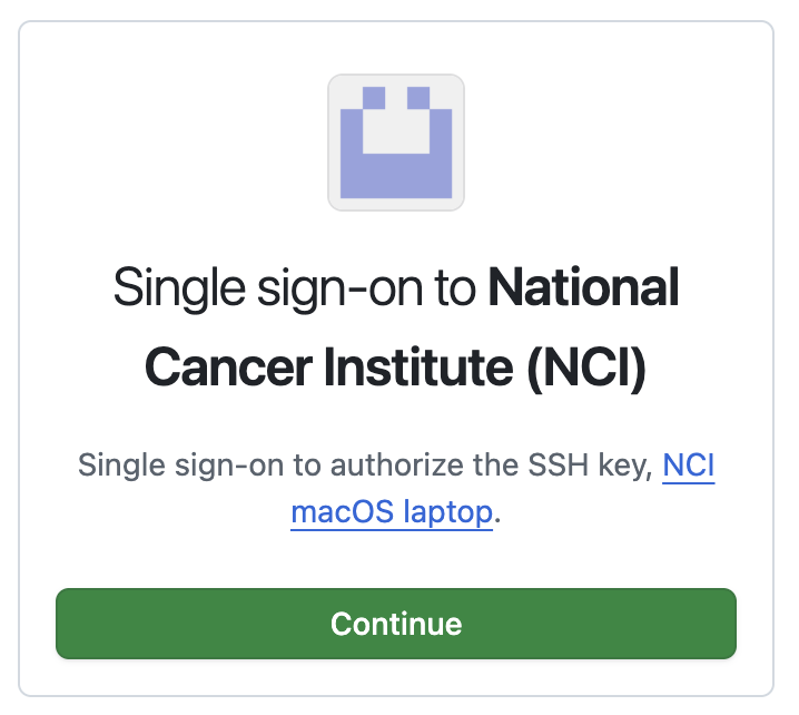 For each NCI Enterprise GitHub organization that you are a member of, you will need to configure the key for single sign-on.