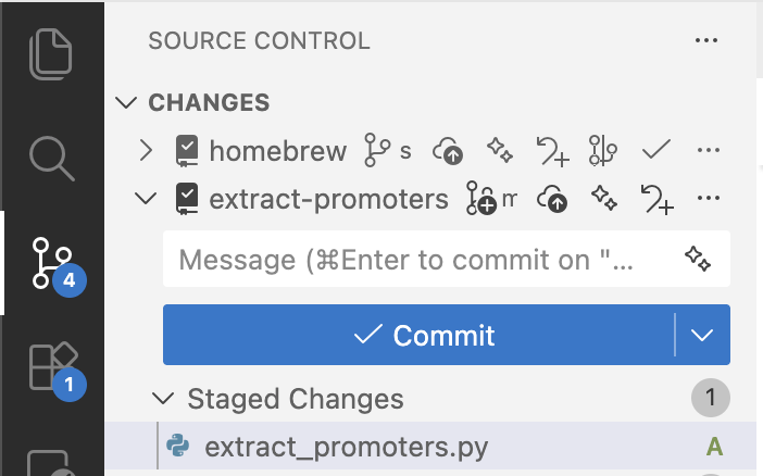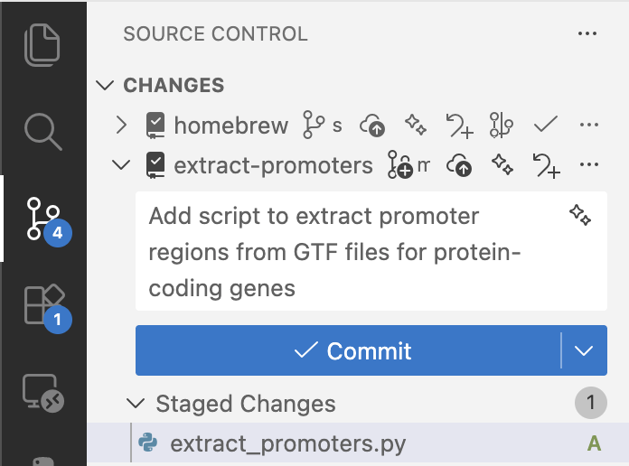 Copilot can even suggest commit messages for you! Using the Source Control extension, add your script to the git staging area and ask Copilot to suggest a commit message.